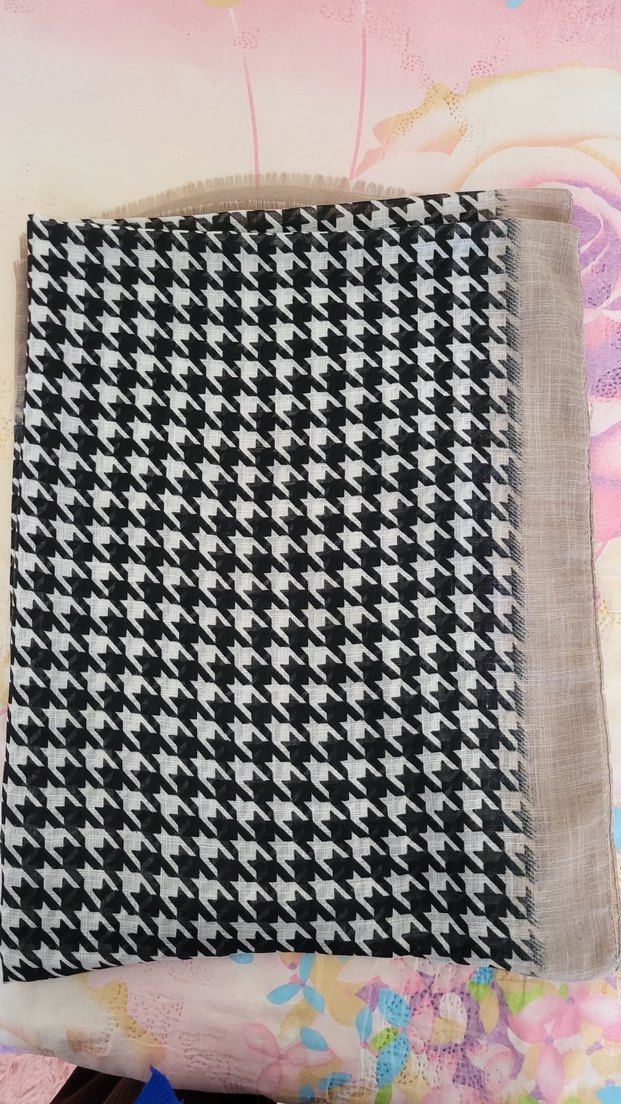 Gri kazayağı desenli, fırfırlı kenarları olan, yumuşak sentetik kumaştan bohem tarzda kadın atkısı.
