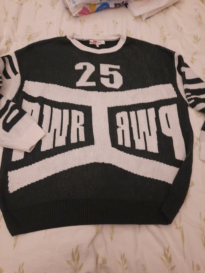 örgü, salaş kesim, uzun kollu ve bisiklet yaka kadın kazak. Üzerinde "25" sayısı ve baskılı desen bulunur, sokak modasına uygun grunge punk tarzı.