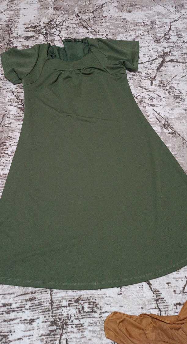 Salaş kesim, drapeli haki hamile elbisesi, tek renk ve kısa kolludur. Sentetik yumuşak kumaştan üretilmiş, günlük dış mekan kullanımı için uygundur.