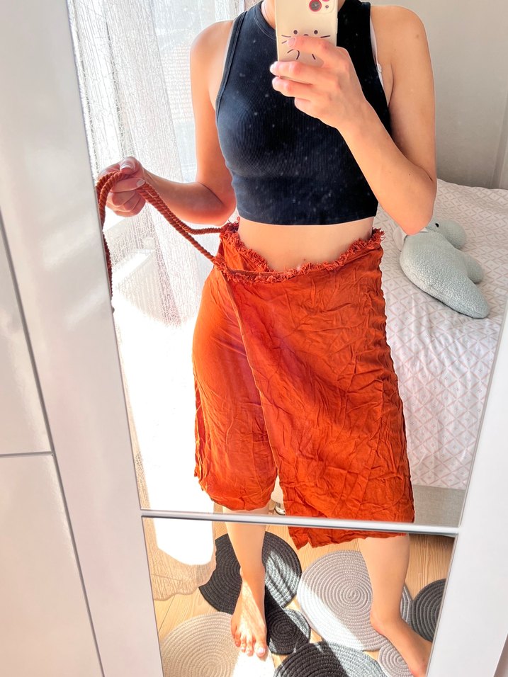 Salaş Kesim Kahverengi Turuncu Keten Midi Pantolon