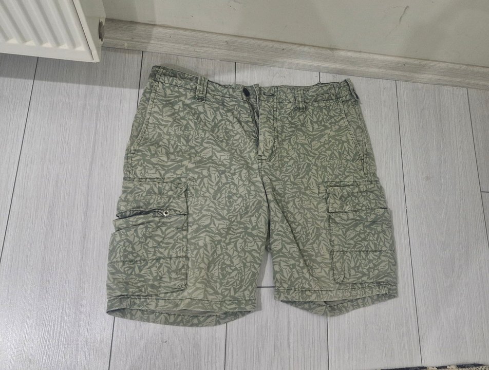 Haki renkli kamuflaj desenli, salaş kesim ve kemerli erkek şort. Dış mekan ve sokak tarzı için uygun, kısa boylu ve kullanışlı ceplidir.