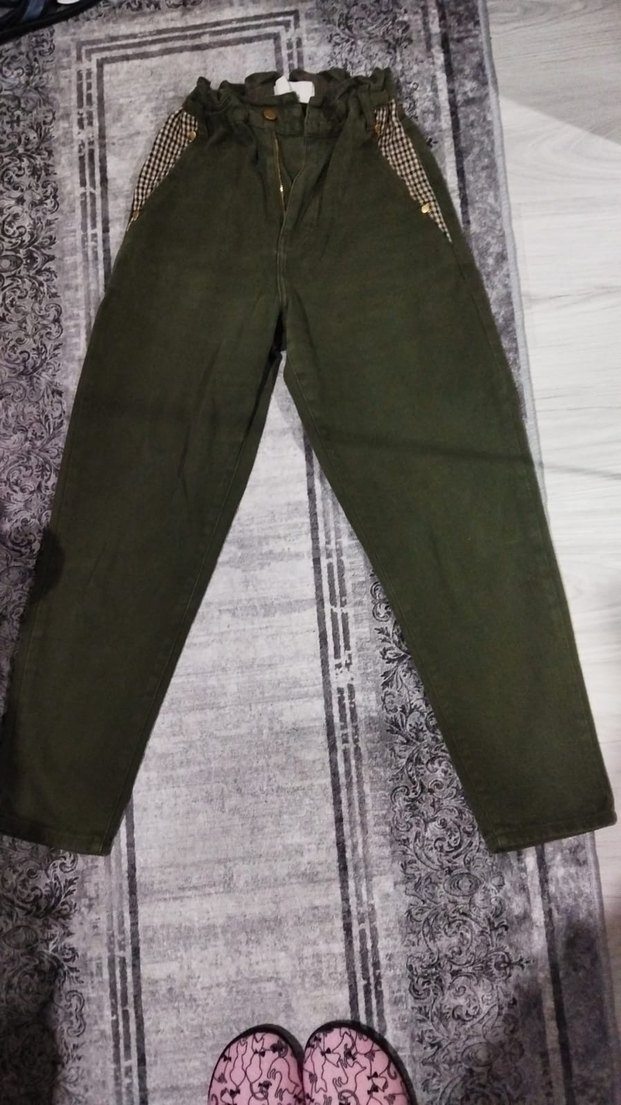 Salaş kesim, kemerli haki kumaş pantolon, günlük kullanıma uygun midi boyda. Grunge punk etkili rahat sokak stili pantolon.