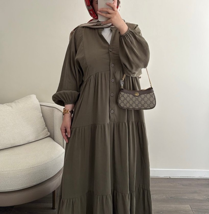 Kemerli, salaş kesim ve yüksek yakalı uzun elbise. İnce askılı kollara sahip, yumuşak sentetik kumaştan yapılmıştır. Günlük kullanıma uygundur.
