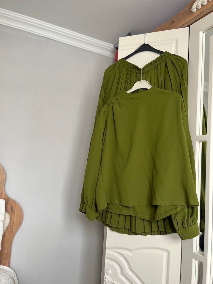 Salaş kesim keten hamile bluzu, uzun kollu ve straplez yaka detaylıdır. Drapeli tasarımı ve normal midi boyu ile minimalist tarza uygundur. Koyu haki rengi günlük kullanıma şıklık katar.