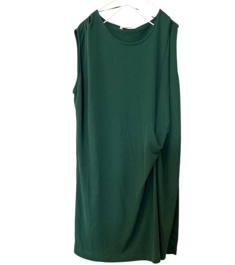 Kolsuz, salaş kesim, drapeli. Yuvarlak yaka ve uzun boy, koyu yeşil renkte, yumuşak sentetik kumaştan üretilmiştir.