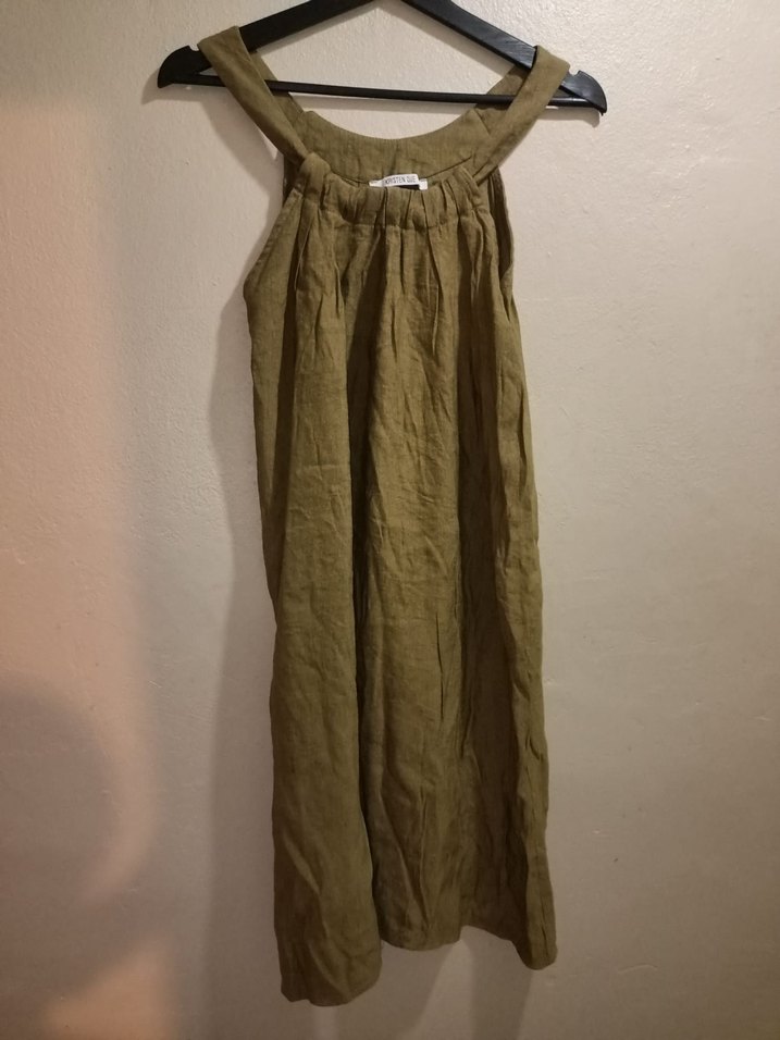 Salaş kesim, kolsuz keten midi elbise. Halter kayık yaka Rengi haki yeşili ve zeytin yeşili gibi . Kirli sarı ve hardal tonlarına yakın, kahverengiye çalan bir yeşil. Boy 91 En 47 Beden s