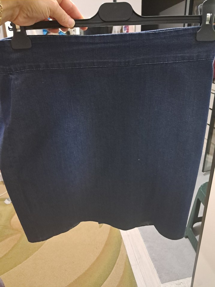 Lacivert kot etek, salaş kesim ve drapeli tasarıma sahip, midi boyda. Desensiz sade modeli günlük ve ofis kullanımı için uygundur.