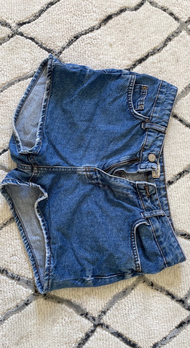 Salaş kesim, mavi midi boy denim şort, tokalı detaylı ve gündelik kullanım için uygun sade tasarım.