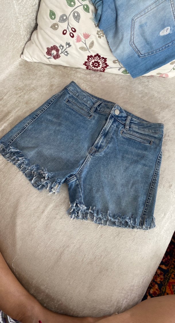 Mavi kot şort, salaş kesimi ve kısa boyuyla rahat bir stil sunar. Püsküllü kenarlarıyla gündelik sokak modasına uygundur. M beden için esnektir kısa şort