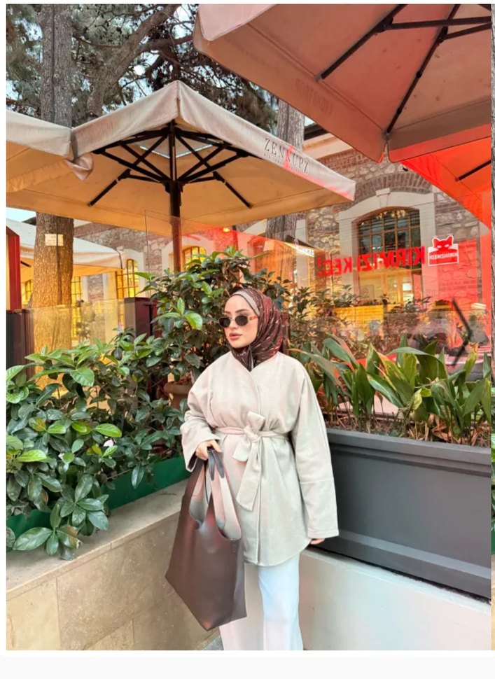 Salaş kesim, normal midi boy kadın kaban, uzun kollu ve yüksek yakalıdır. Sentetik kumaştan yapılmış, açık camel renkte ve batik desenlidir. Günlük sokak stiline uygun, zahmetsiz şıklık sunar.
