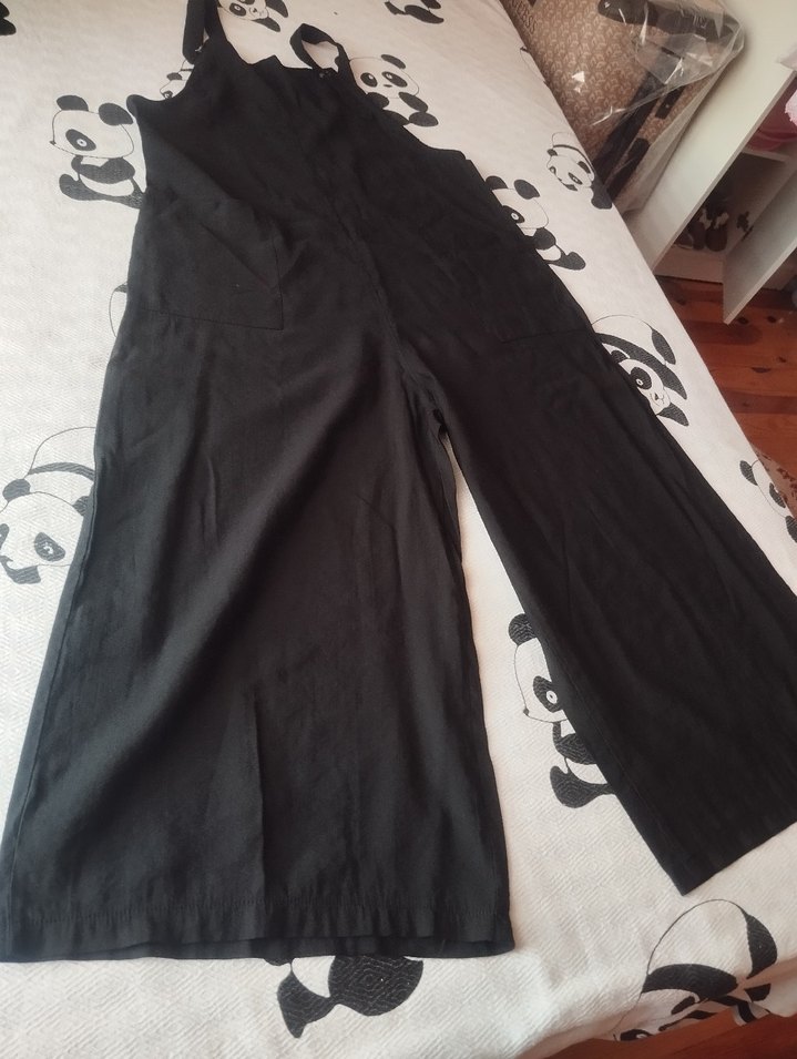 Yumuşak keten kumaştan, salaş kesim, askısız siyah hamile tulumu. Kolsuz ve drapeli detaylara sahip, günlük rahat kullanım için uygundur.