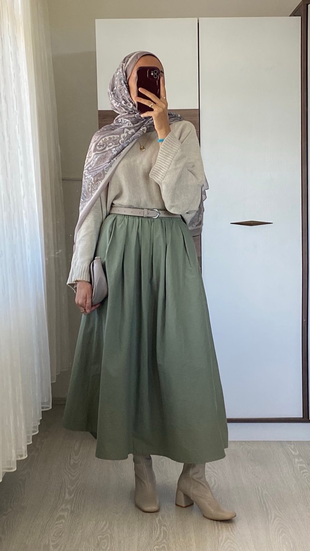 Bu uzun etek, salaş kesimi ve drapeli tasarımıyla rahat bir kullanım sunar. Günlük kullanıma uygun, pastel haki renklidir.