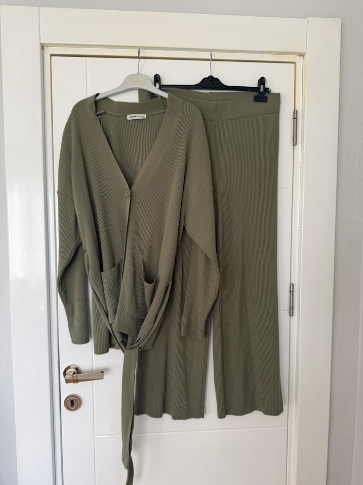 Salaş kesim ve uzun kollu, kruvaze yaka hırka ile ön cepli, aynı kumaştan pantolon seti. Yumuşak dokulu, haki renkte rahat bir takım.