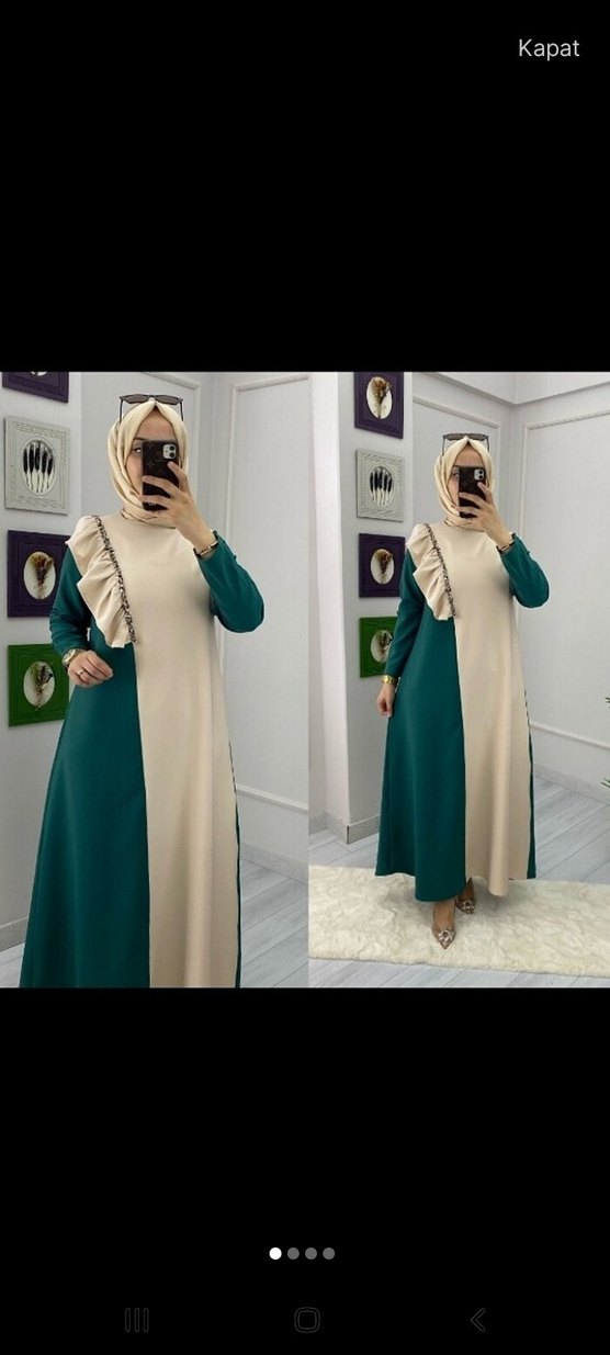 Salaş kesim, uzun kollu, drapeli, açık haki ve yeşil renklerde uzun elbise. Bisiklet yaka ve baskılı deseniyle sade sokak stili için uygundur.