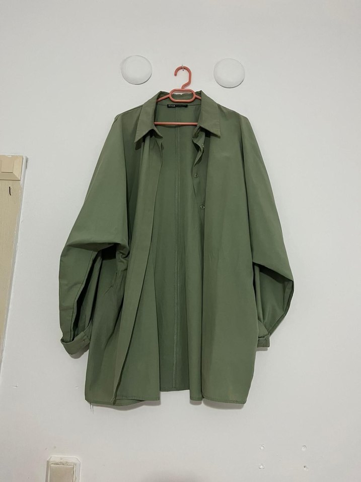 Salaş kesim, keten kumaştan yapılmış uzun kollu khaki renk gömlek. Minimalist sokak stili için yakalı ve drapeli tasarıma sahip. Desensiz, günlük kullanıma uygun.