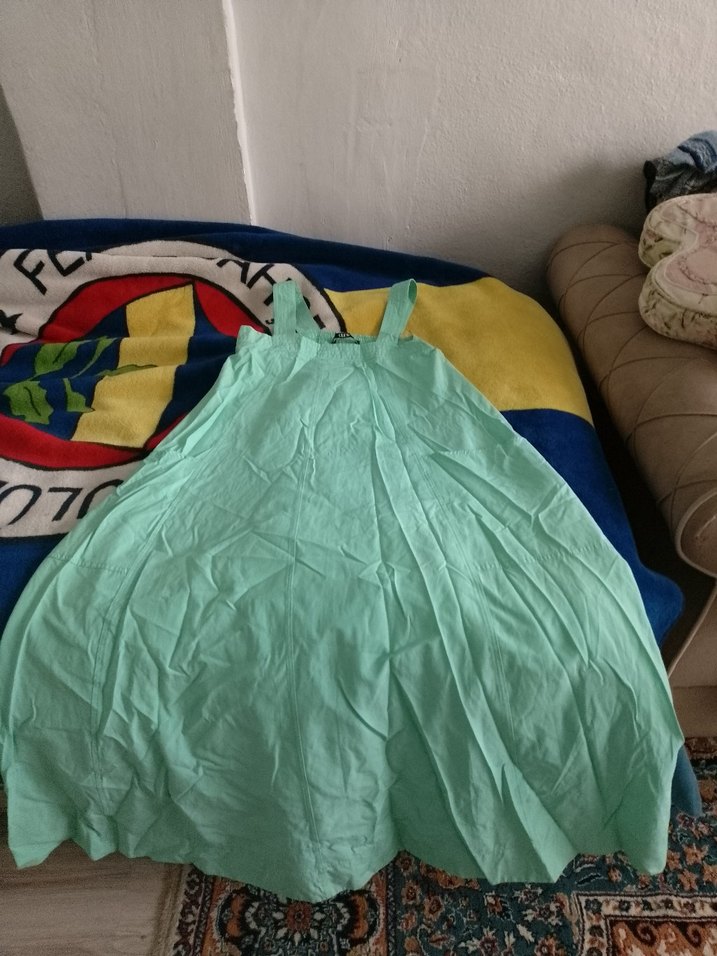 Yumuşak sentetik kumaştan üretilmiş, salaş kesim uzun kadın elbisesi. Askılı ve pastel çok renkli, bohem tarzı için uygun.omuz genişliği 40 boy 104