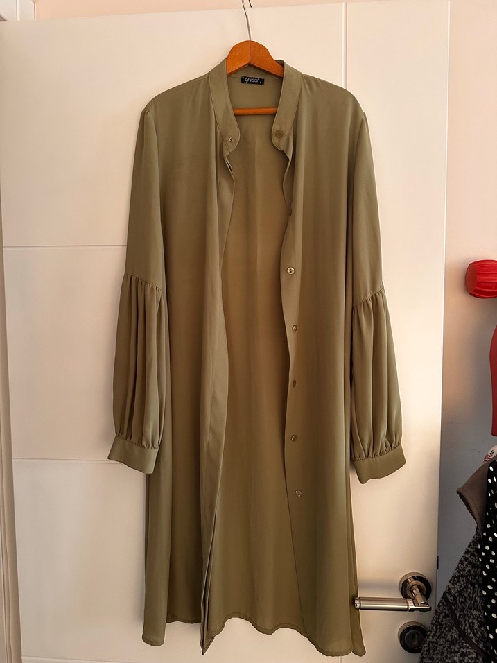 Uzun, salaş kesim, haki renk uzun tunik diz aldı ipek krep kumaş