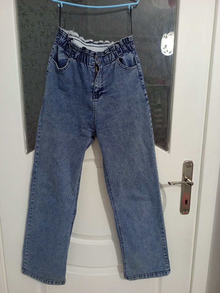 -mavi renkte, ve salaş kesime sahip, normal boy midi kot pantolon. Denim kumaştan üretilmiş, günlük sokak stiline uygun.