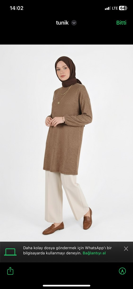 salaş kesim, midi boyda, uzun kollu ve yuvarlak yakalı tunik, yanlarda yırtmaç vardır! günlük kullanıma uygun sade ve modern bir tasarıma sahiptir.