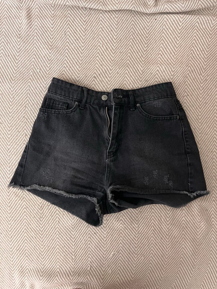 Salaş kesim, siyah kot şort. Kısa boy, doğal bitişli ve gündelik stil için uygun, rahat sokak giyimi tarzında. Beli yapılıdır 65 cm dir