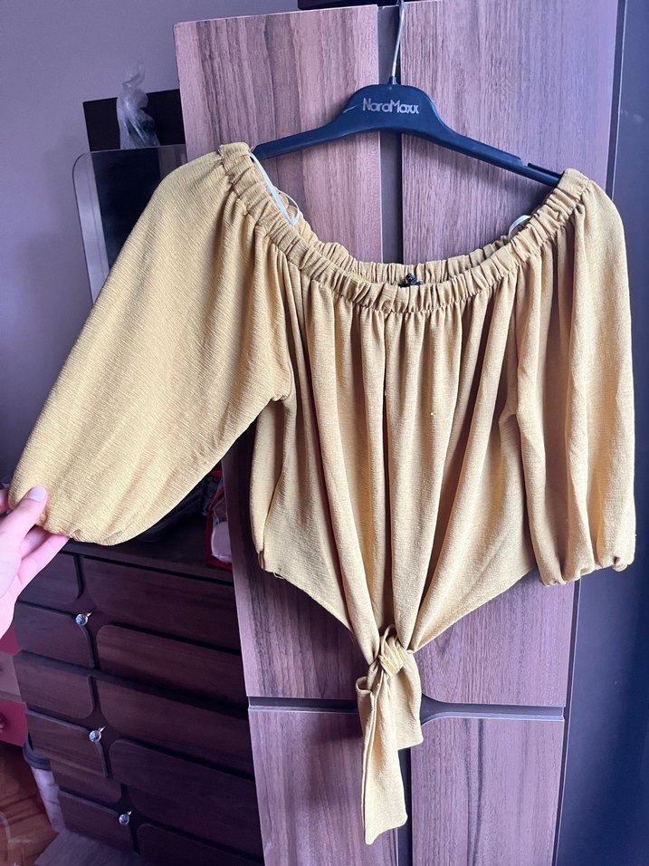 Hardal sarısı renkli,crop, salaş kesim, straplez ve drapeli detaylı bohem tarzda günlük kullanıma uygun
