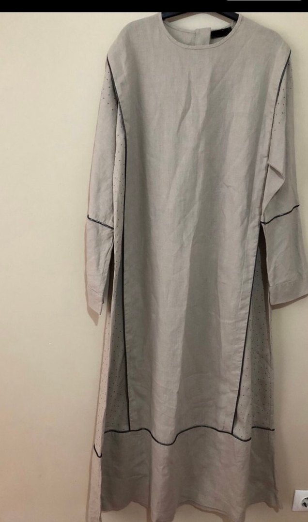 Kumaş Keten oldukça rahat ve salaş kesim şerit ve minik taş larla süslü Keten elbise veya Namazlık çekme yapmaz.. Göğüs 120 cm Kolboyu 60 Boy 140