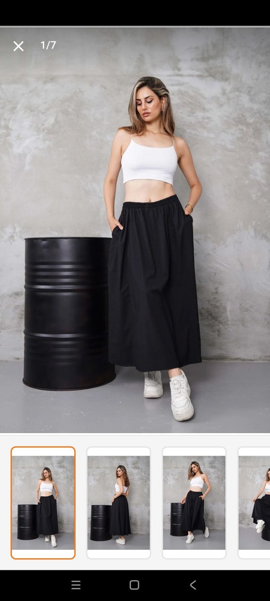 salaş kesim siyah uzun etek, gündelik kullanım için uygun, desen içermeyen rahat bir tasarıma sahiptir. poplin kumaştan üretilmiştir boyu 90 cm standart bedendir 44 bedene kadar uyumludur 1 kere giyildi deformesi yoktur.