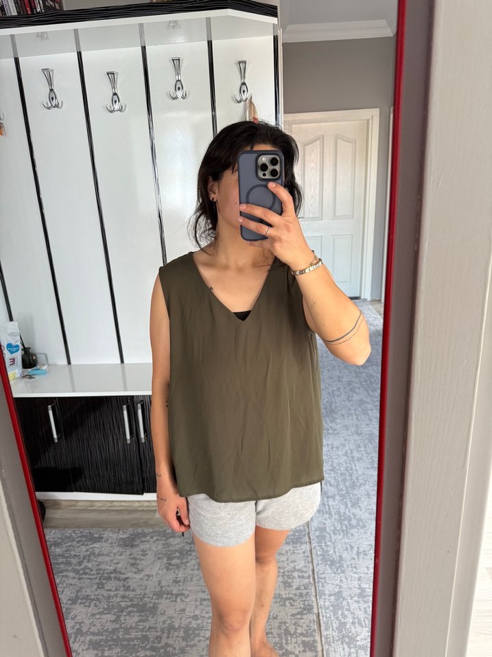Salaş kesim, V yaka ve kolsuz tasarıma sahip kadın atlet. Satenimsi kumaştan yapılmış, günlük kullanım ve sokak stili için uygun.