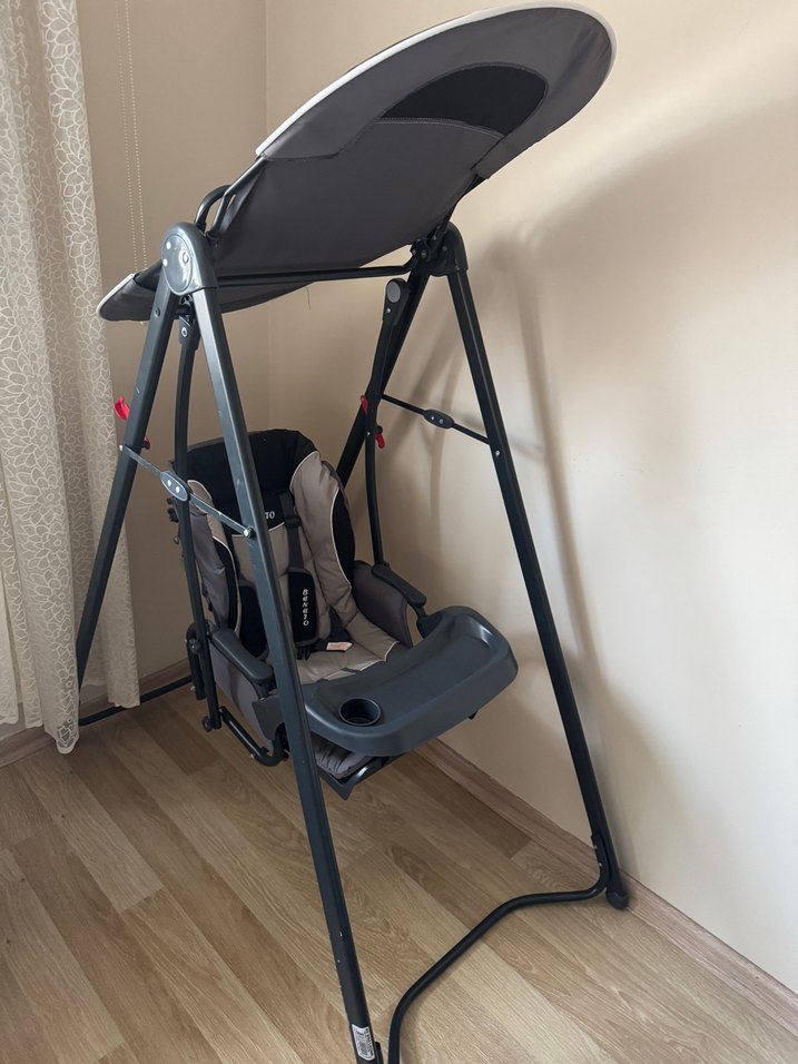 Gri renkli mama sandalyesi, sağlam iskelet ve ayarlanabilir tente içerir. Emniyet kemeri ve bardak tutuculu tepsi bulunur.