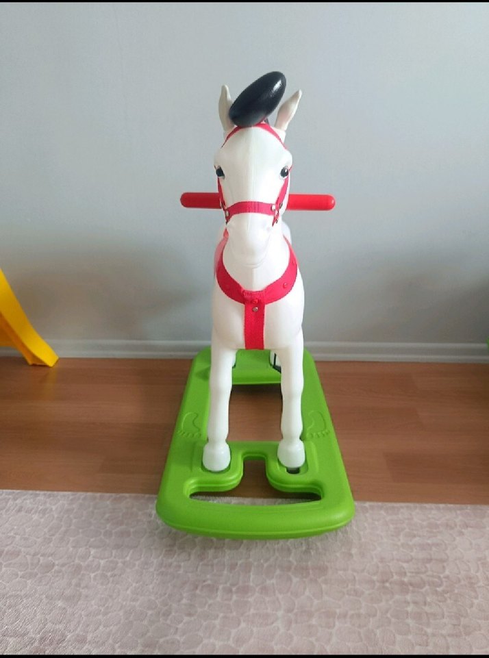 Bu renkli sallanan oyuncak at, beyaz gövde, kırmızı koşum takımı ve yeşil taban ile çocukların oyununa uygun olarak tasarlanmıştır. Pilsan marka