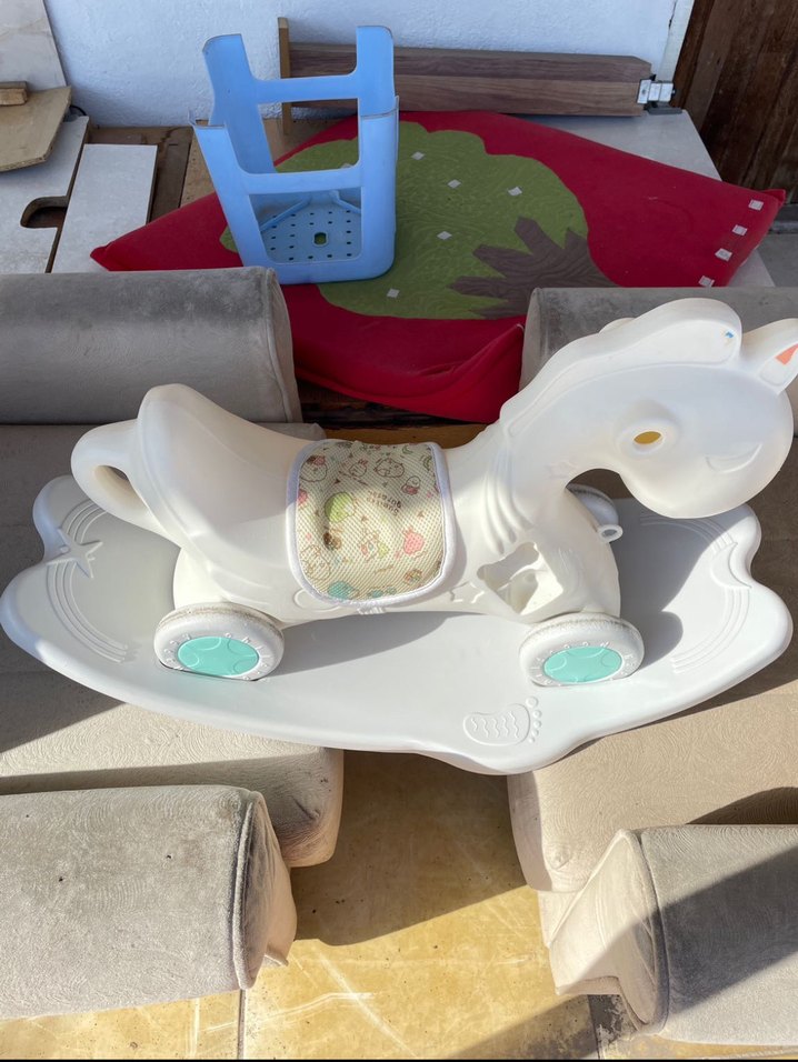 Unigo / Uthingo markasına aittir. Kurulum kağıdı mevcuttur. Tutma aparatları da mevcuttur. Kırık çatlak yoktur. Pastel renkli tekerlekleri ve desenli yastıklı oturağı olan beyaz sallanan at oyuncak, küçük çocuklar için uygundur. Sallanan taban ve tekerleklerle çok yönlü kullanım sağlar.