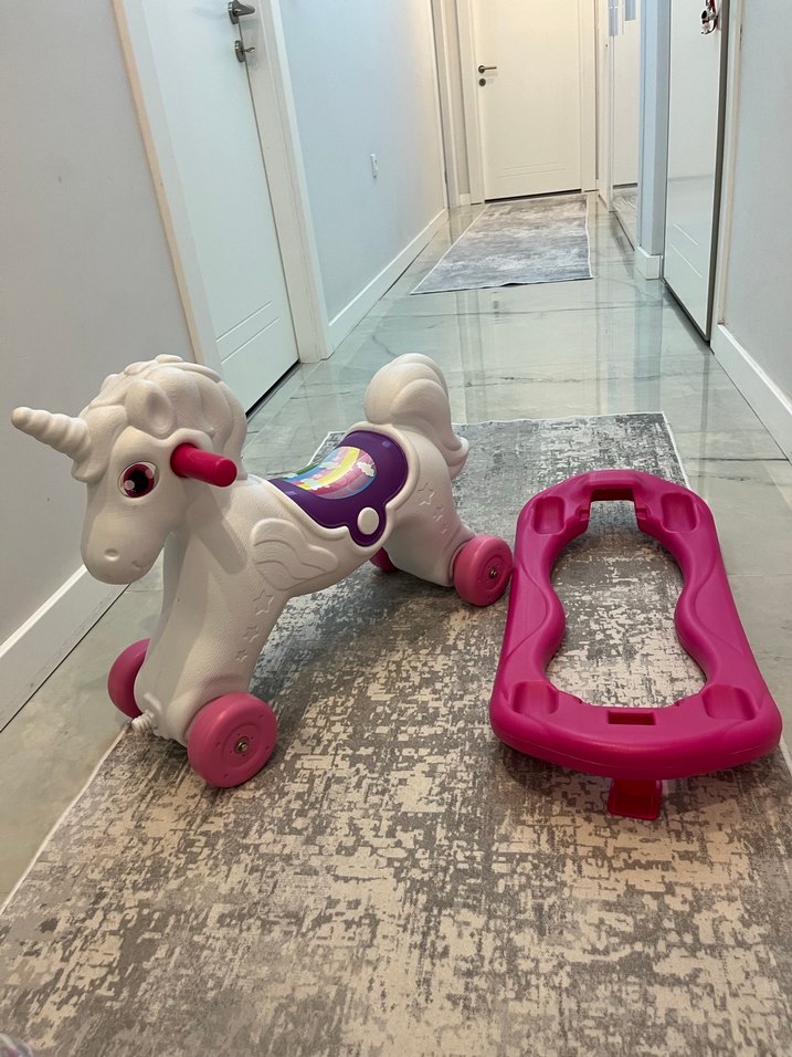 Tekerlekli ve çıkarılabilir tabanlı açık pembe unicorn oyuncak. Renkli eyer ve dayanıklı yapıya sahiptir. Sallanan at