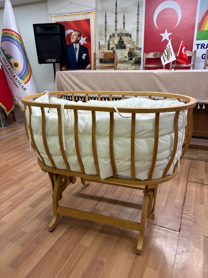 Ahşap gövdesi ve beyaz pastel dolgulu iç kısmıyla sade ve sağlam yapıda bebek beşiği. Uyku setiyle birlikte gönderilecektir.