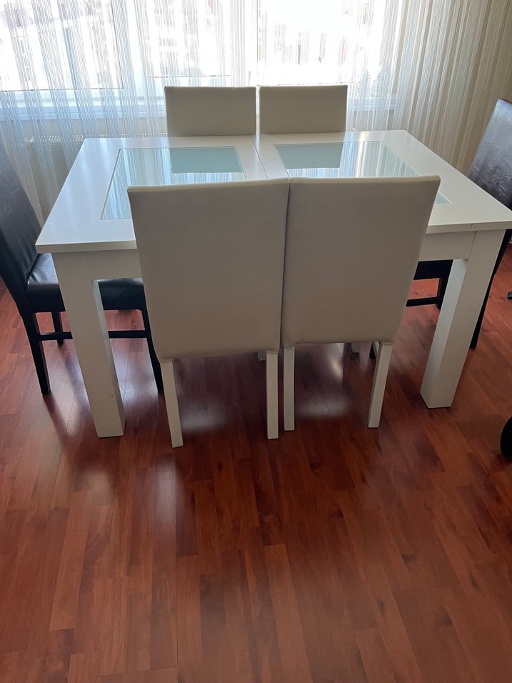 Temiz kullanılmış salon açılanilir masa 6 deri sandalyeli masa takımı venge renkti beyaza boyandı sağlam mobilya