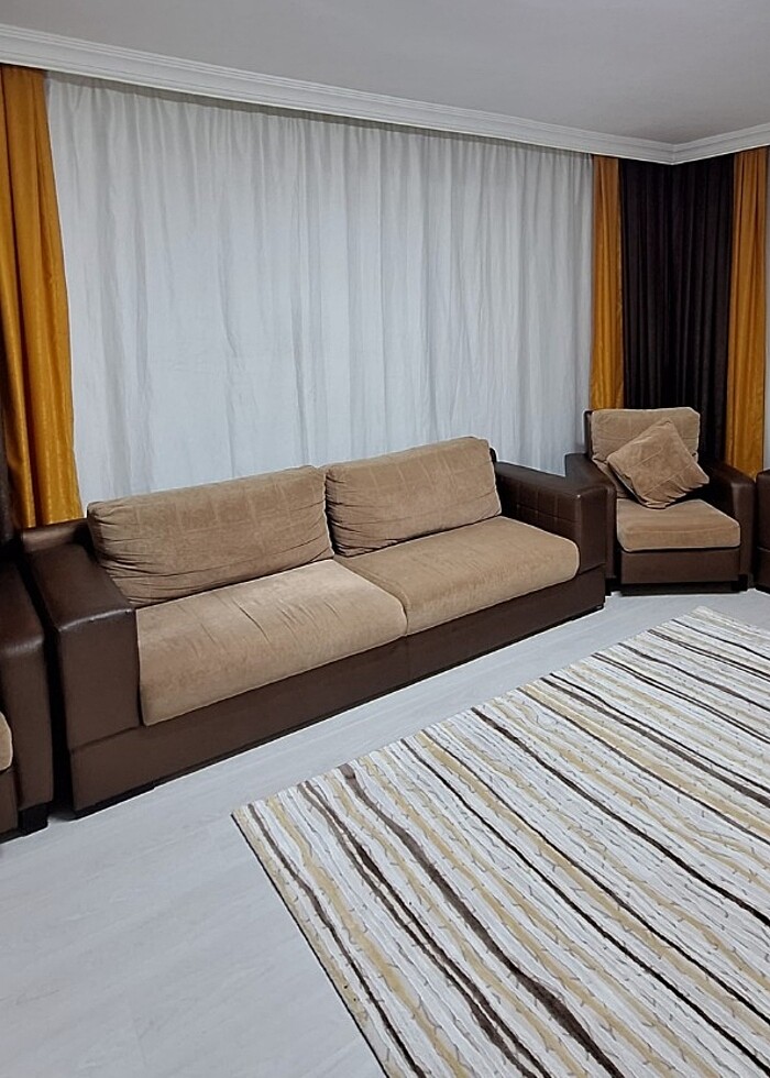 - 1 adet üçlü koltuk - 1 adet ikili koltuk - 2 adet berjer - 4 adet kırlent - Üçlü koltuk, yatak olmaktadır. - İkili koltugun alt kısmında bazası (saklama alanı) vardır. - Hepsinin toplam fiyatı: 10. 000 Liradır. Fon perdeler 2.000 liradır. Perde bağı ve duvara monte edilen kristal topları vardır. - Mobilyalar, Konfor markadır. - Afyonkarahisar il merkezindedir.