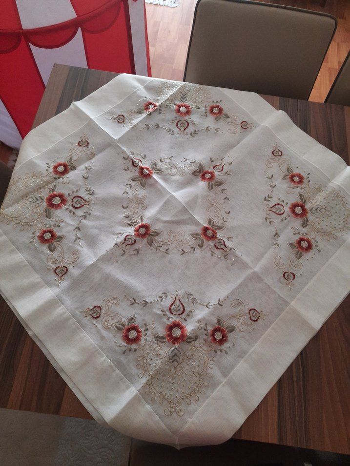 2 adet fiskos ya da masa örtüsü, 2 adet büyük kare sehpa örtüsü, 1 adet runner, 12 adet büfe içi peçete toplam 17 parçadır. Çok az kullanıldı. Temiz durumdadır.