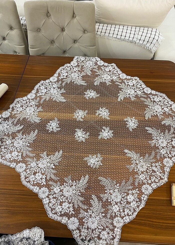 Güpür simli salon takımı hiç kullanılmadı 12 adet vitrin içi 1 adet runner 1 adet kare masa üstü örtüsü