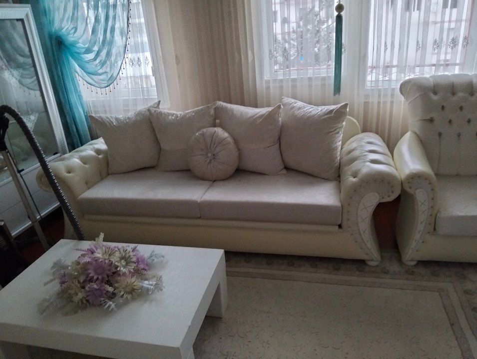 hiç bir sorunu yok tam takım salon takımı iki büyük koltuk iki küçük berjer iki tane gümüşlük konsol altı kişilik masa sandalye orta sehpa dörtlü sehpa