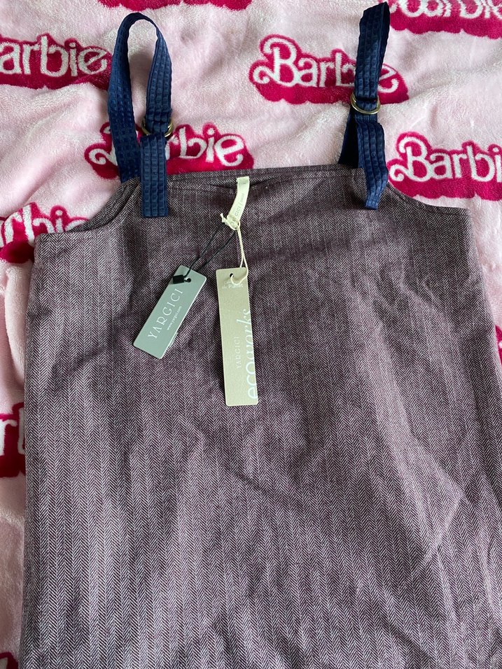 Ayarlanabilir koyu renk askılara sahip, salopet elbise yargıcı ürünüdür