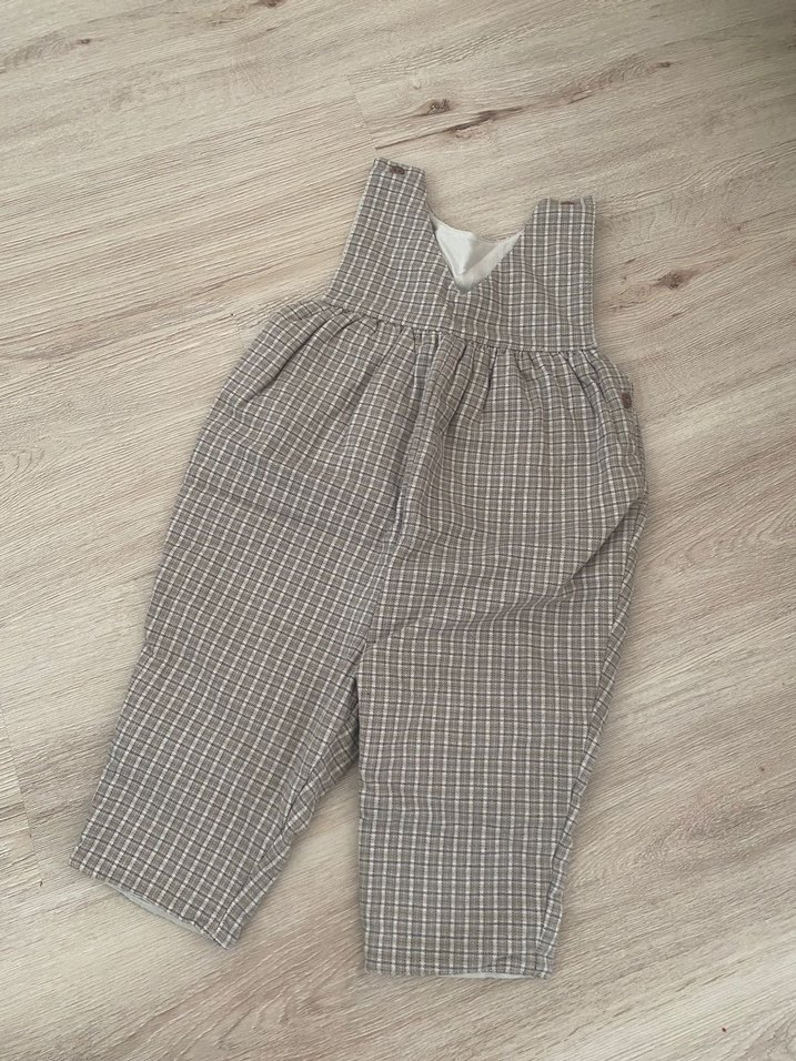 Gri renkte, keten kumaştan, örme dokulu, bol kesim ve kolsuz çocuk tulumu. Normcore tarzında sade bir tasarıma sahiptir. Çift katlı 1-1,5 yaş uyumlu