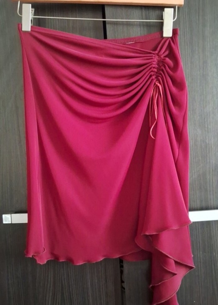 Kenarındaki ip mekanizma gevşetilebilir daraltılabilir, hareketli bir etek, ipin durumuna göre yırtmaç ayarlanabilir. Fotoğrafta daha açık görünüyor fakat çok tatlı bir Bordo.