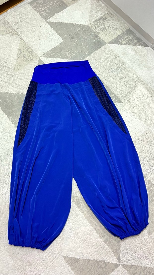 Mavi, bol kesim, dökümlü midi uzunlukta kadın pantolon. Sentetik kumaştan, sokak tarzı ve outdoor kullanıma uygun.