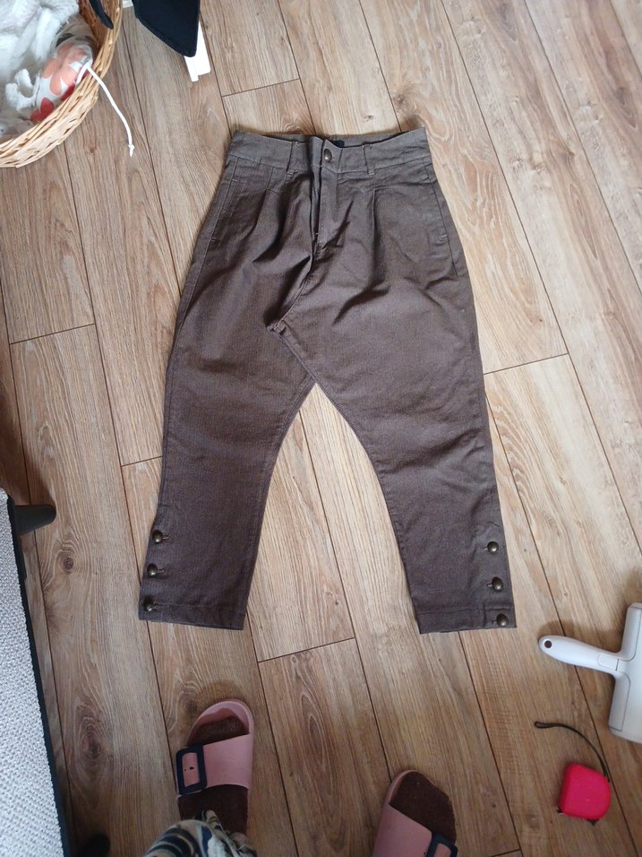 Düğmeli, bol kesim kahverengi keten pantolon, midi boy, gündelik normcore tarzında, günlük kullanıma uygun. ebatlar bel 40 cm basen 60 boy 87