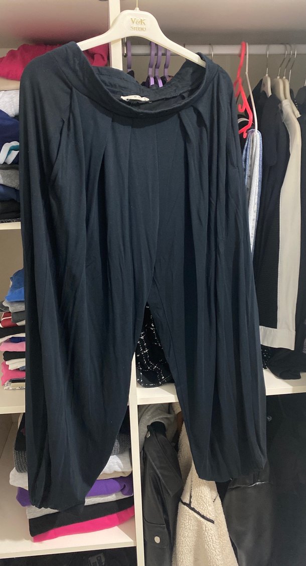 Siyah, salaş kesim, midi boy ve drapeli, ipeksi dokulu kadın pantolon, gündelik sokak modası için uygun. Hiç bir sorunu yok bel bagcıgı yok sadece