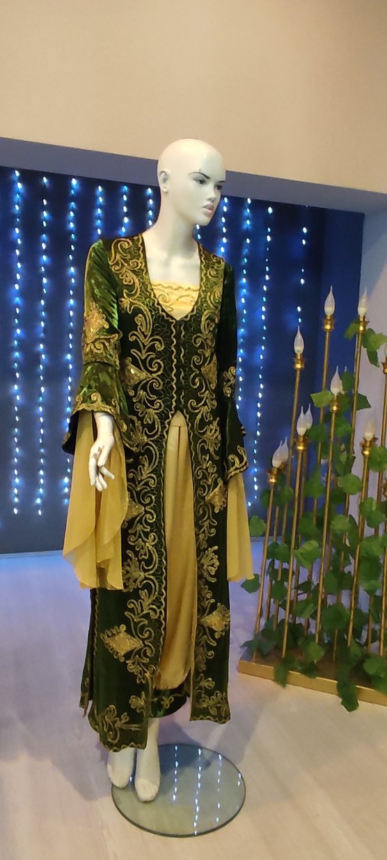 Polyester değildir asterlı saten adı verilen kaliteli kumaş üzerine sırma ve payet işlemelidir. Manken 38 bedendir. Deforme yoktur.