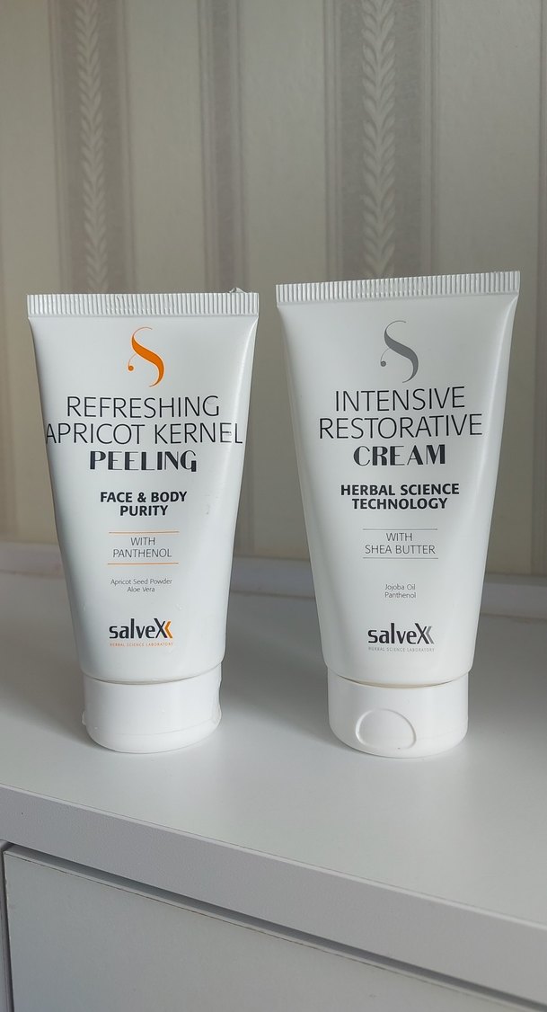 SalveX markasının kayısı çekirdeği özlü yüz ve vücut peelingi ile shea butter içeren yoğun onarıcı kremi. Bitkisel bilim teknolojisiyle üretilmiştir. Her ikisi de yüzde seksen dolu.