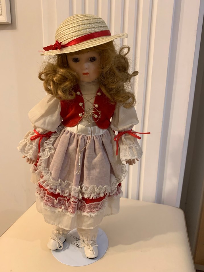 Dantel ve kırmızı detaylarla süslenmiş geleneksel kıyafetli, saman şapkalı beyaz bebek. Kıvırcık saç ve beyaz ayakkabıları bulunur. Temiz bir üründür.Çocuğunızu sevindirmek isterseniz,bu tamda size göre bir üründür.