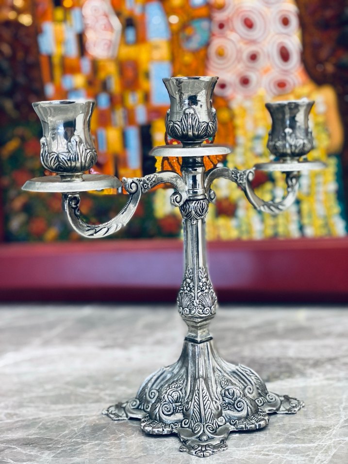 Vintage gümüş renkli, üç kollu şamdan, detaylı çiçek desenleri ve geniş taban ile şık dekor için uygundur. Vitrin ürünü. Sorunsuzdur. İADE YOKTUR #şamdan #3kolluşamdan #vintage #retro #antika #antikaşamdan #vintageşamdan #orjinal #öneri #gümüşkaplama