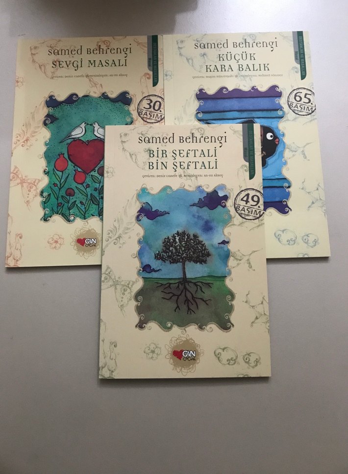 Samed Behrengi'nin 'Küçük Kara Balık', 'Bir Şeftali Bin Şeftali' ve 'Sevgi Masalı' adlı üç şiir kitabı seti, özel kapak tasarımlarıyla.
