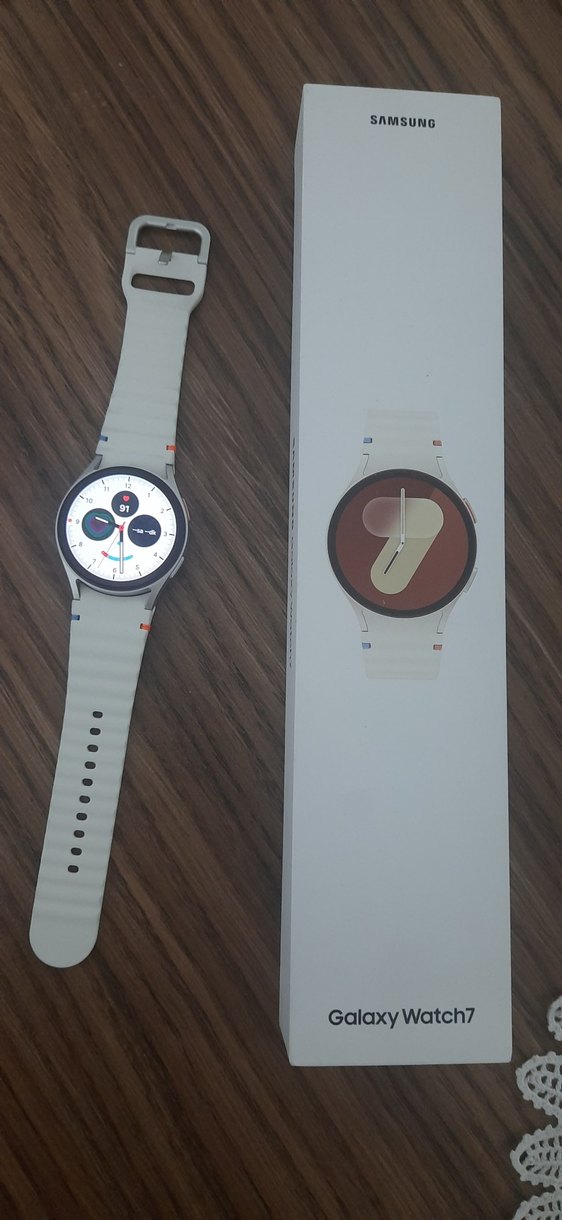 Samsung beyaz renkli, gri ekran çerçevesine sahip, yuvarlak ekranlı ve ayarlanabilir kayışlı akıllı saat. Sağlık ve saat göstergeleri bulunur. ⌚